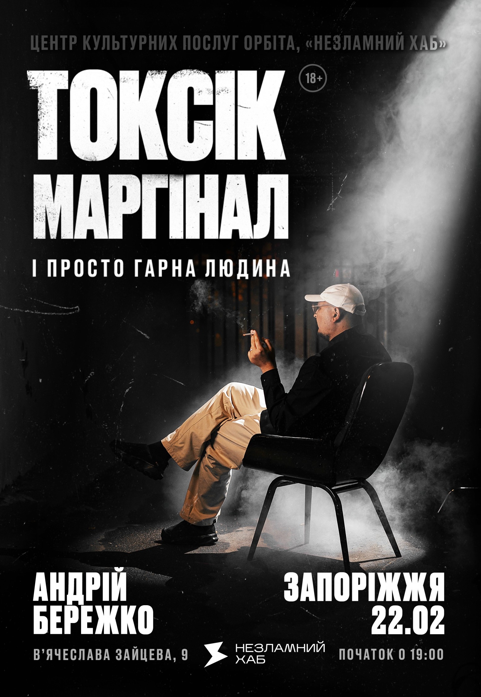 Токсік, маргінал і просто гарна людина. Андрій Бережко відбудеться 22 лютого 2026, 19:00, неділя в НЕЗЛАМНИЙ ХАБ. За допомогою сервісу internet-bilet.ua, Ви зможете з легкістю забронювати, замовити та купити квитки на концерт, спектакль, оперу, балет, майстер-класи, спортивні та дитячі заходи, що Вас цікавлять, оплативши їх найбільш зручним для Вас способом: через інтернет банківською карткою VISA/MasterCard, готівкою або кур'єром, якщо зробите замовлення квитка з доставкою.