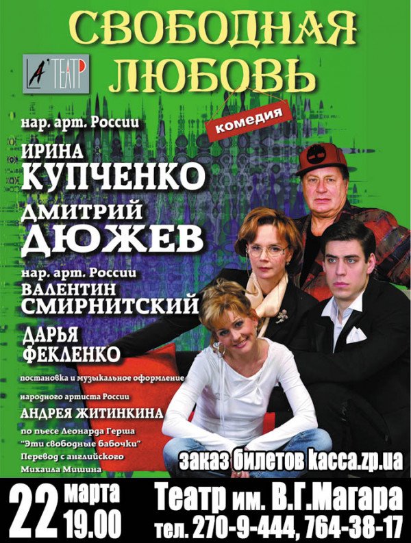 Свободная любовь відбудеться 22 березня 2013, 19:00, п’ятниця в Запорізький театр імені В. Г. Магара. За допомогою сервісу internet-bilet.ua, Ви зможете з легкістю забронювати, замовити та купити квитки на концерт, спектакль, оперу, балет, майстер-класи, спортивні та дитячі заходи, що Вас цікавлять, оплативши їх найбільш зручним для Вас способом: через інтернет банківською карткою VISA/MasterCard, готівкою або кур'єром, якщо зробите замовлення квитка з доставкою.