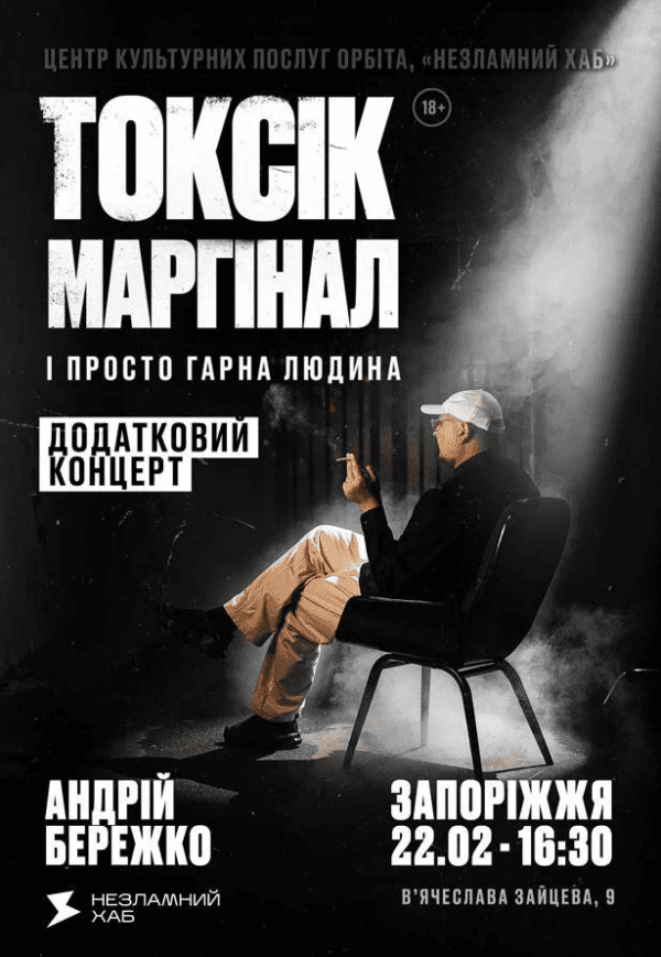 Токсік, маргінал і просто гарна людина. Андрій Бережко відбудеться 22 лютого 2026, 16:30, неділя в НЕЗЛАМНИЙ ХАБ. За допомогою сервісу internet-bilet.ua, Ви зможете з легкістю забронювати, замовити та купити квитки на концерт, спектакль, оперу, балет, майстер-класи, спортивні та дитячі заходи, що Вас цікавлять, оплативши їх найбільш зручним для Вас способом: через інтернет банківською карткою VISA/MasterCard, готівкою або кур'єром, якщо зробите замовлення квитка з доставкою.